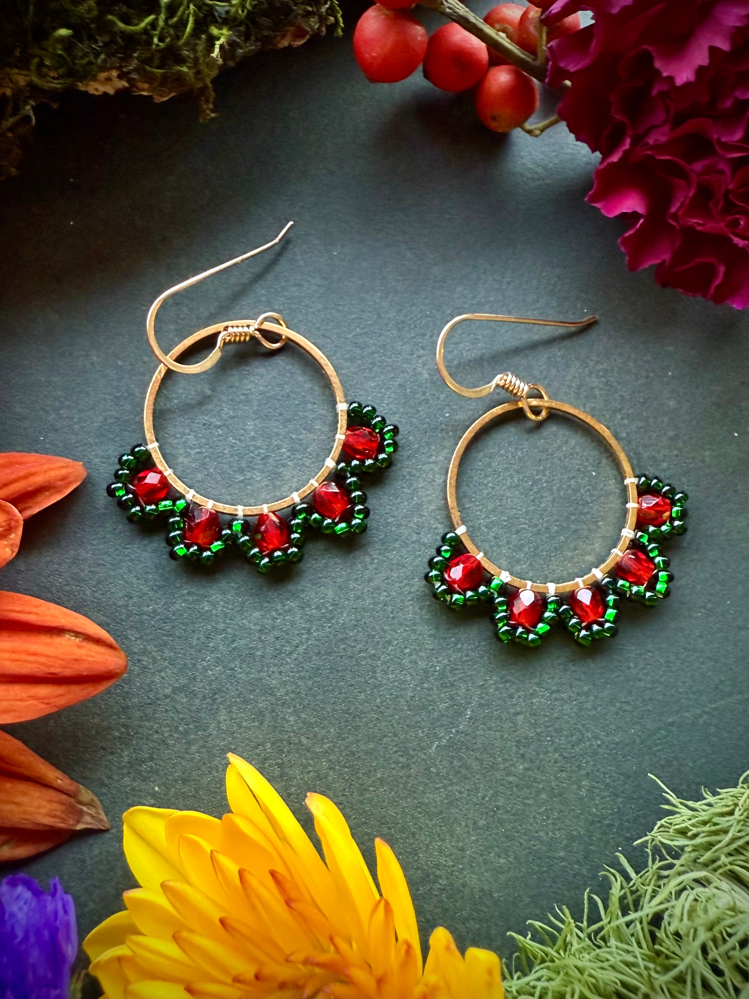 Create your own festive Holly Hoop earrings using firepolished beads and seed beads. Follow along with our super easy step by step tutorial on YouTube and learn how to create this quick and easy design! This project is perfect for beginners who are interested in getting started with bead weaving and attaching beads to metal frames.