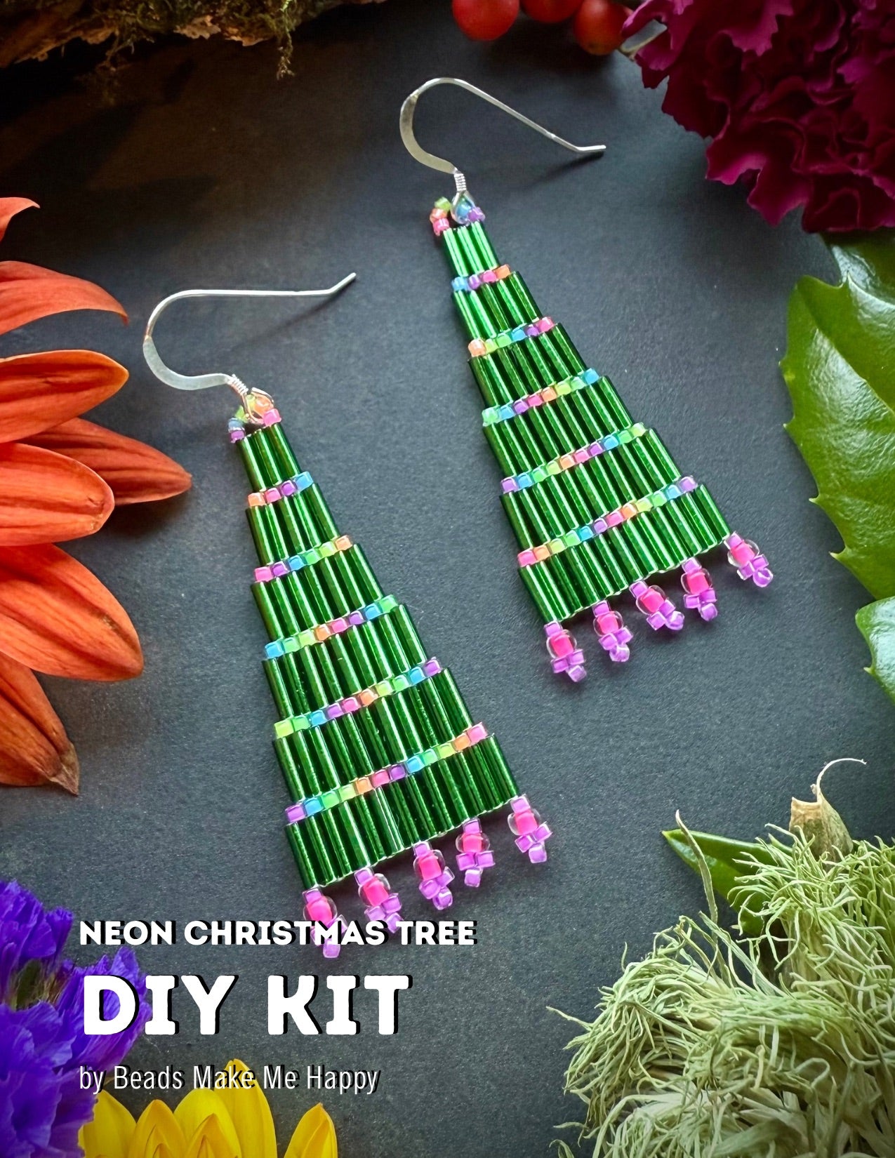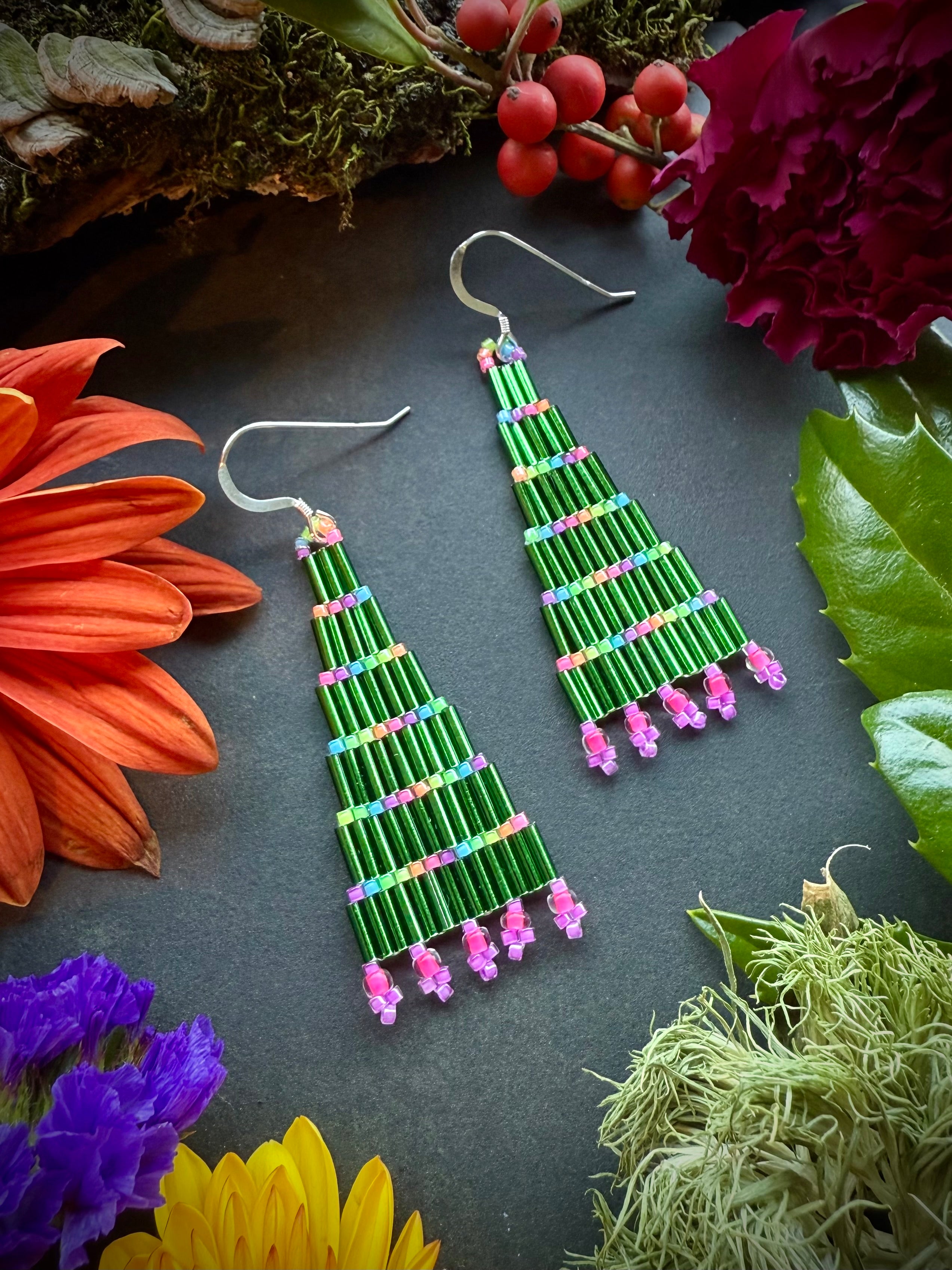Create your own Christmas Tree Earrings using bugle beads and delicas. Follow along with our super easy step by step tutorial on YouTube! This project is perfect for beginners who are interested in getting started with bead weaving.